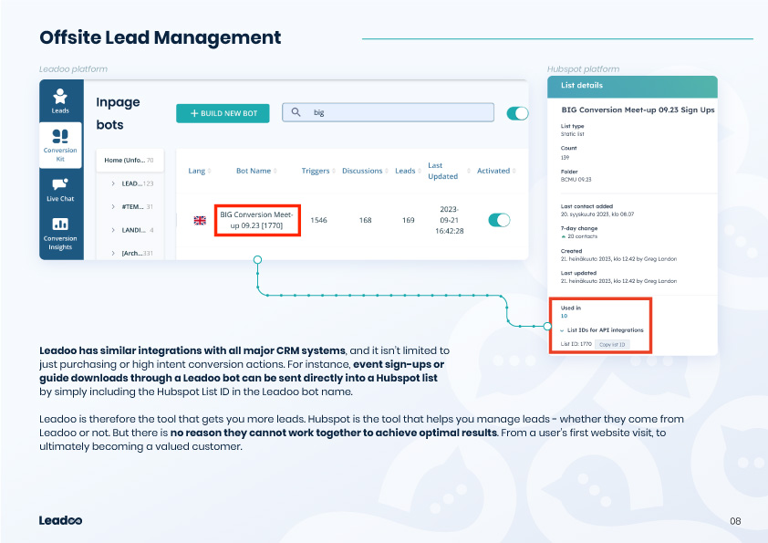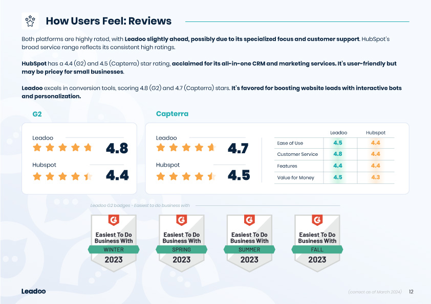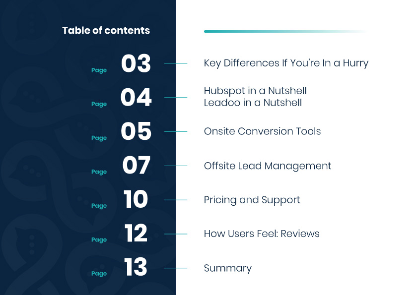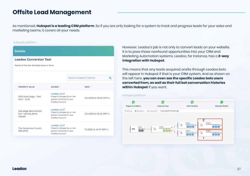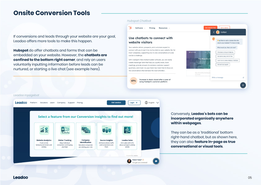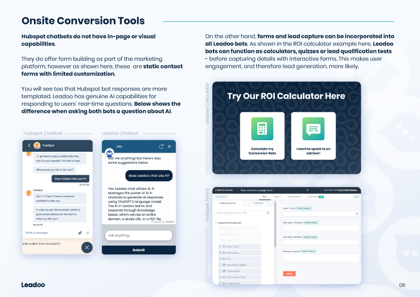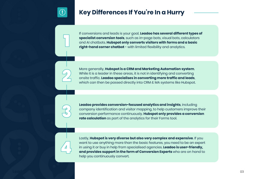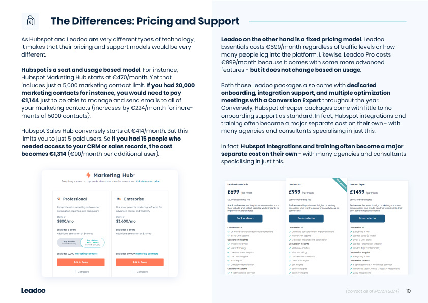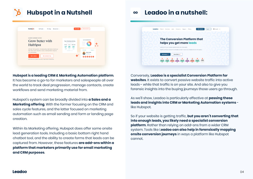 I was tasked with designing a comparison PDF between Leadoo and HubSpot, focusing on visually guiding the reader through the key differences and advantages of each platform. While the research and content were provided, my role was to translate this information into an engaging and easy-to-follow design.