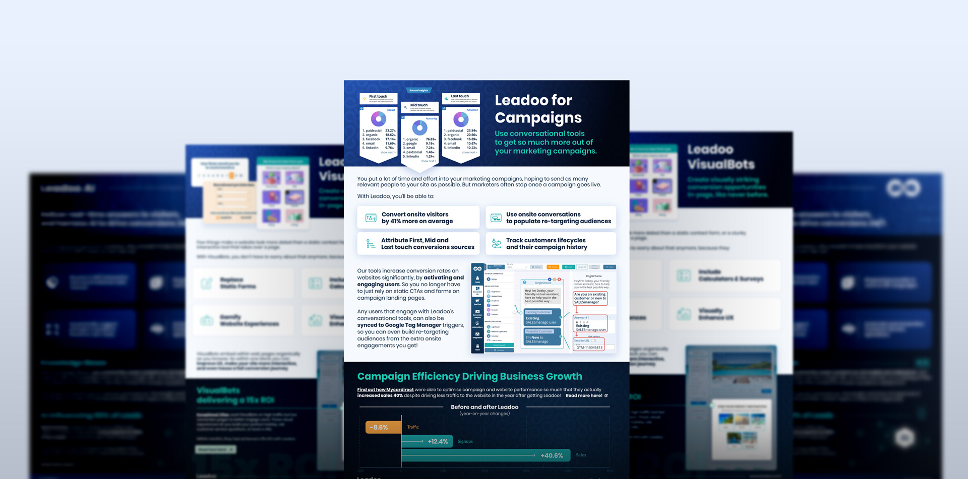 I designed a set of visually engaging one-page PDF documents aimed at streamlining the sales process for Leadoo’s team. Each document focuses on the core features of Leadoo’s offerings, presenting the key points in a clear, concise, and professional layout. These PDFs are tailored to help salespeople quickly grasp the product’s value and communicate its features effectively, ensuring an efficient and impactful sales experience.